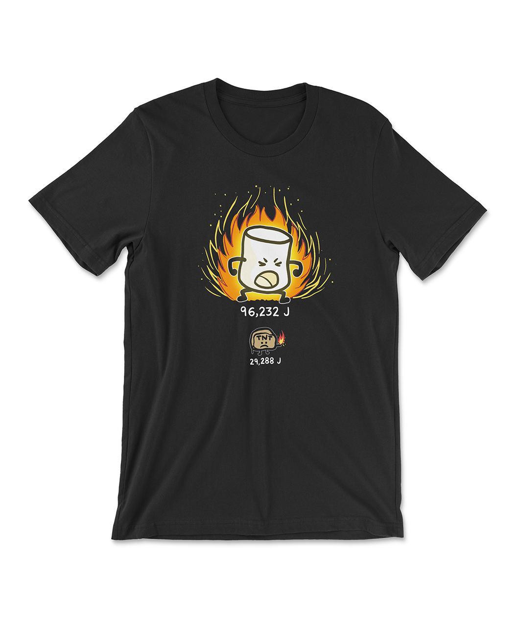 ¡Cuidado, porque este malvavisco es peligroso! ¿Sabías que 7 gramos de malvavisco contienen más energía química que 7 gramos de TNT? Sin embargo, no te preocupes por tu próxima acampada, ya que solo el azúcar de la superficie de tu malvavisco podrá reaccionar con el oxígeno y quemarse, por lo que tu malvavisco liberará esa energía muy, MUY lentamente. Y deliciosamente.