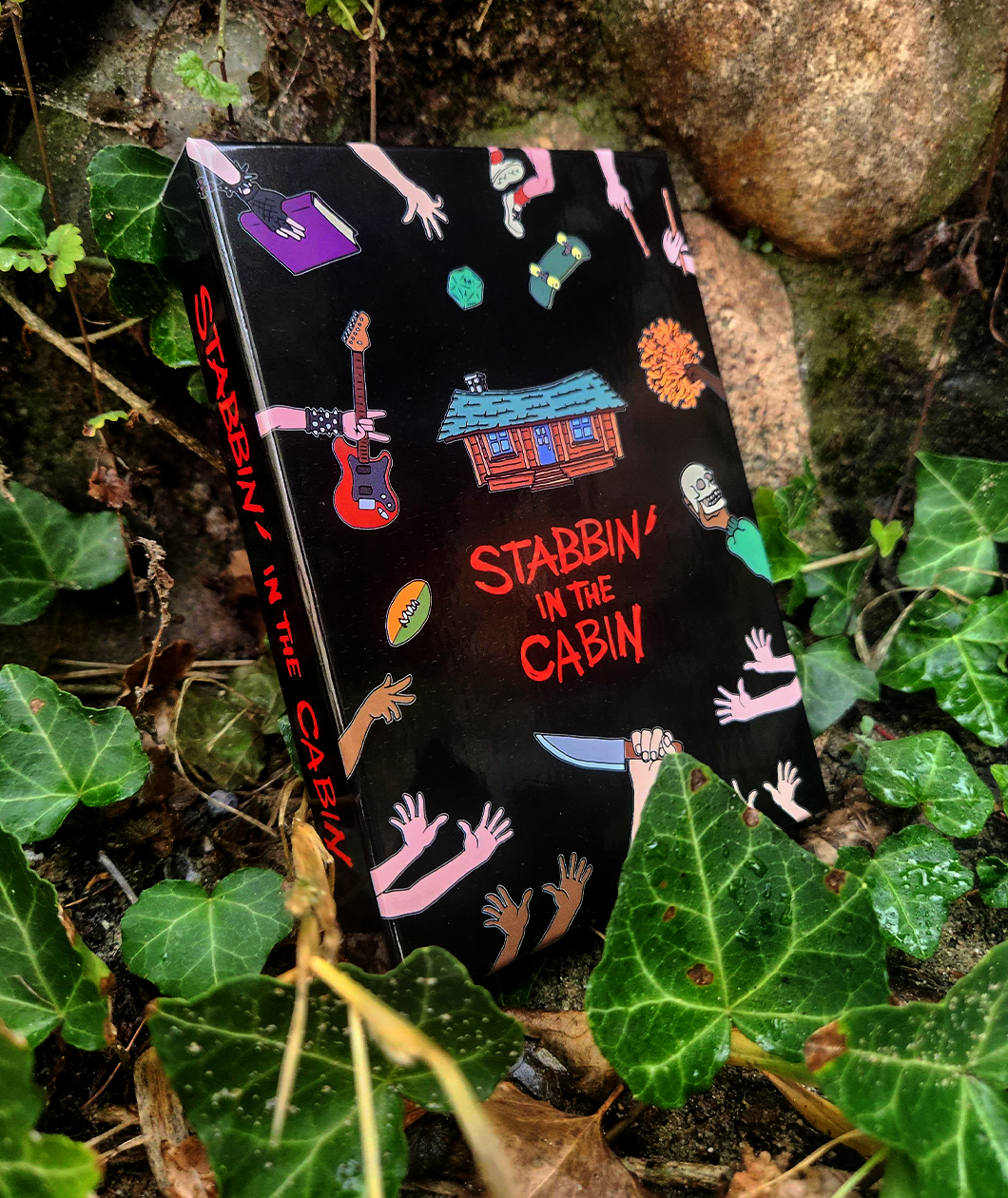 Stabbin in the Cabin Board game box and instructions booklet on a wooden table. Bo is open so you can see the 100 red translucent cubes, 10 meeples, and deck of cards. Outside of the box is a glossy black with the character printed on it and Stabbin in the Cabin in bright red in a drippy bloodlike font. Inside of the box is bright red. Instructions booklet is black with white and red text.