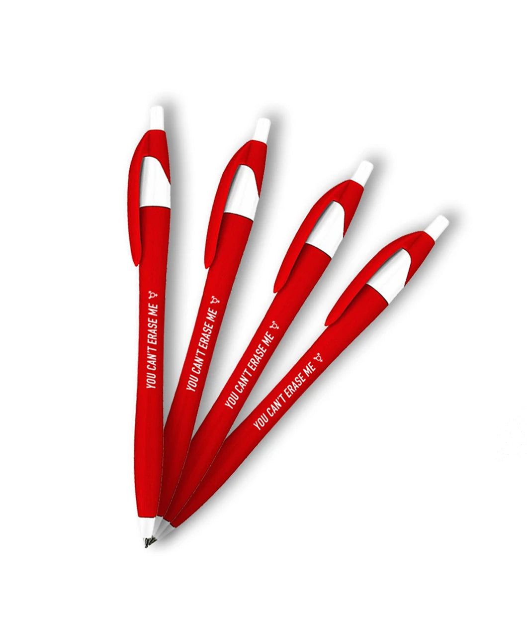 Trans people can't be erased, and neither can these pens! Use this set of four black ink pens to write your next zine, take notes on your favorite book, or just serve as an everyday reminder on your desk that trans people are real and valued, and no one can take that away from us.