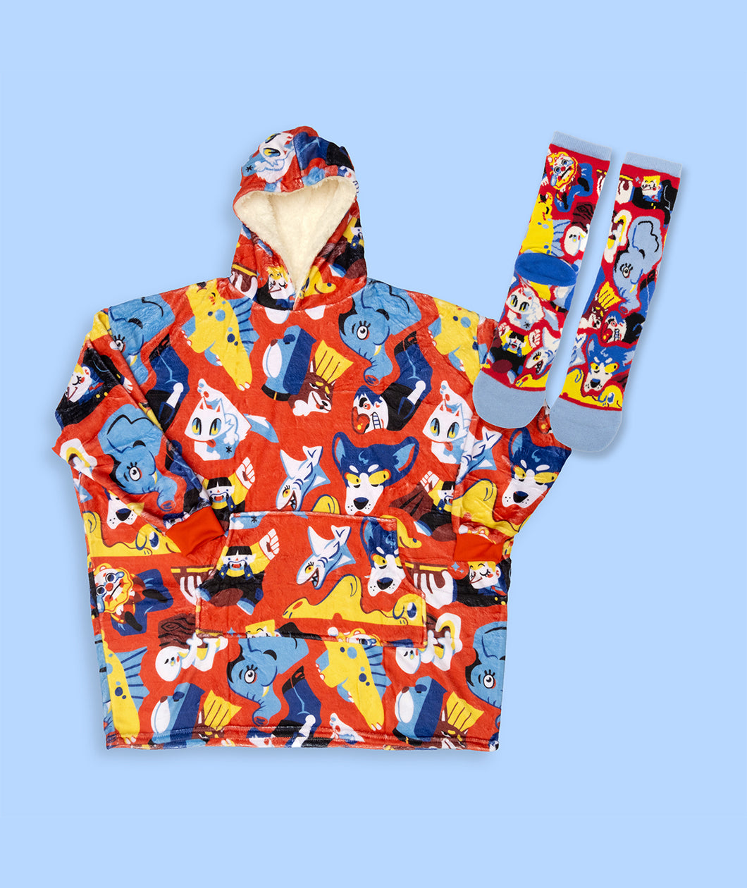 Straight from the Drawfee artboards to your closet, this bundle with the supersoft hooded blanket and wonderful wooly socks is cozy, enveloping, and juuust the right amount of chaotic. Slip them both on, bask in the toasty warmth, and know you’re also helping fund world-changing good with your purchase.