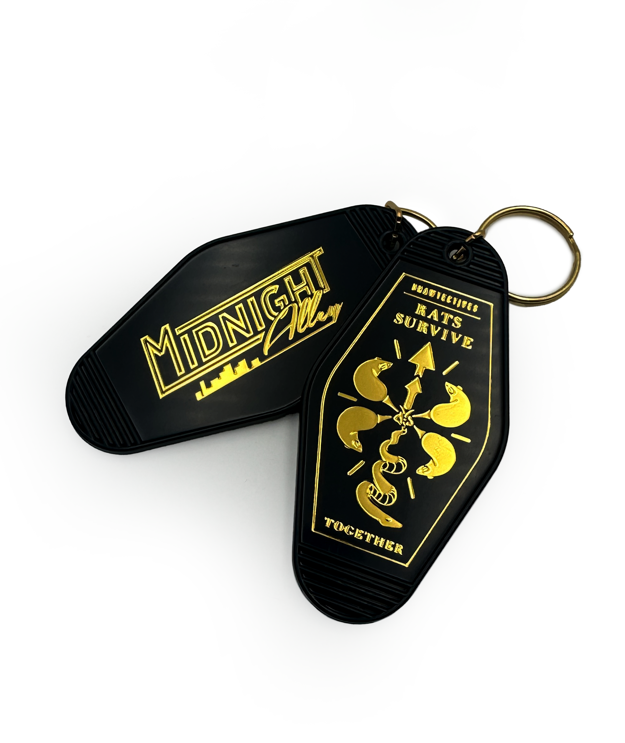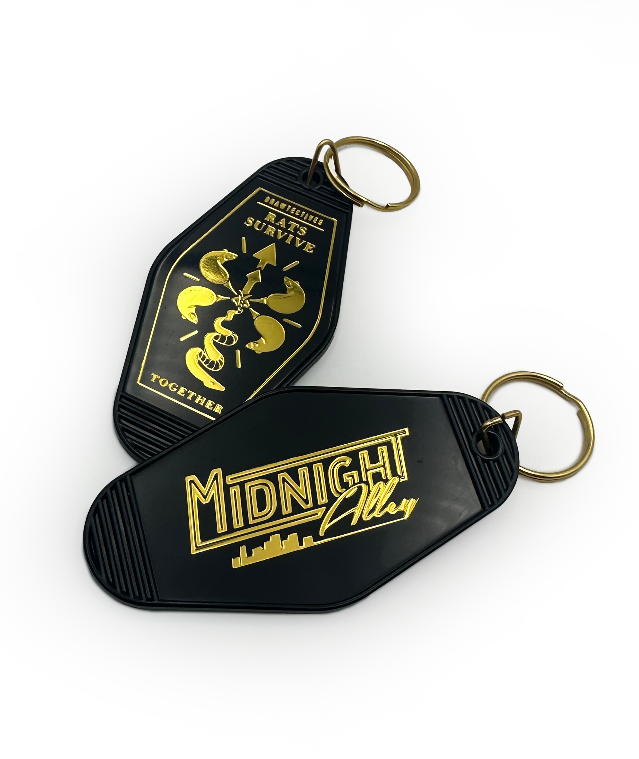 A 3.5in, double-sided, foil-stamped motel keychain with a triangle jump ring.