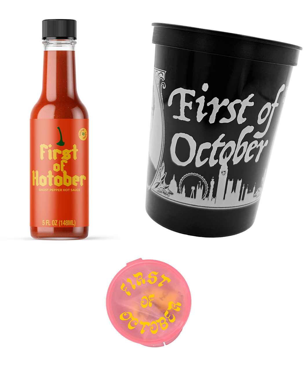 This bundle includes one bottle of First of Hotober Hot Sauce ($13.00), one pair of First of October Groovy Ear Plugs ($10.00) and First of October Stadium Cup ($6.00), all for $21.00.