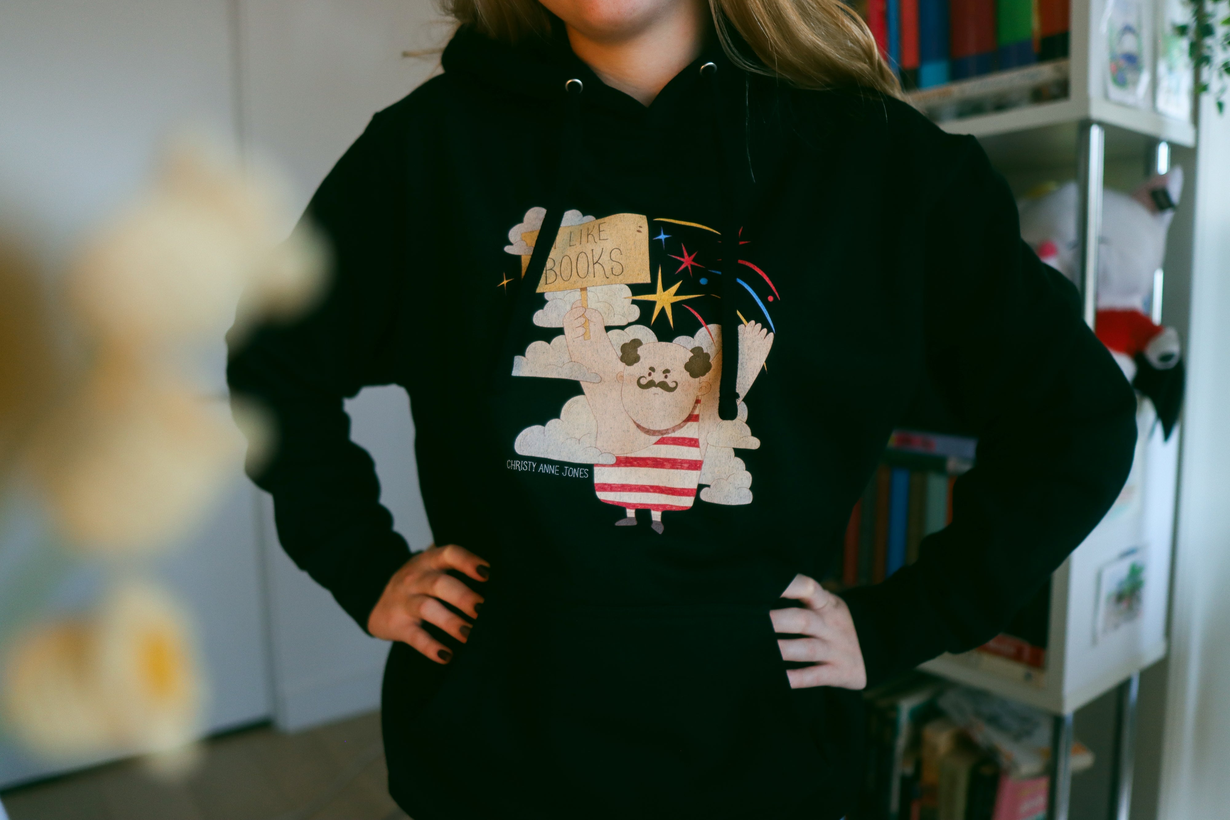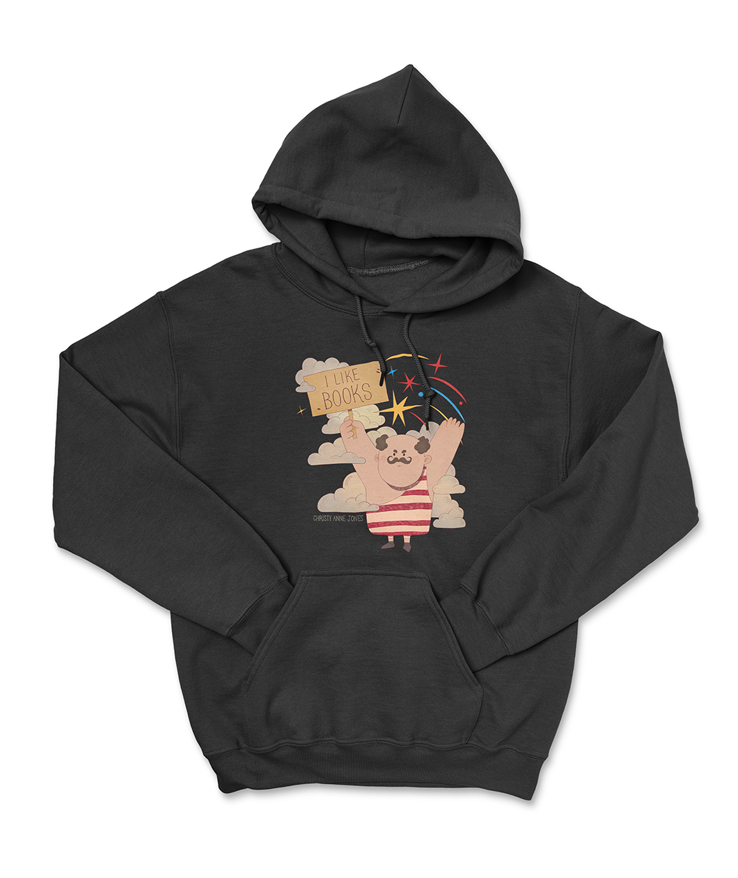 I Like Books hoodie. 80/20 ring-spun cotton/polyester blend fleece with 100% cotton face. Printed at DFTBA Records in Missoula, MT.