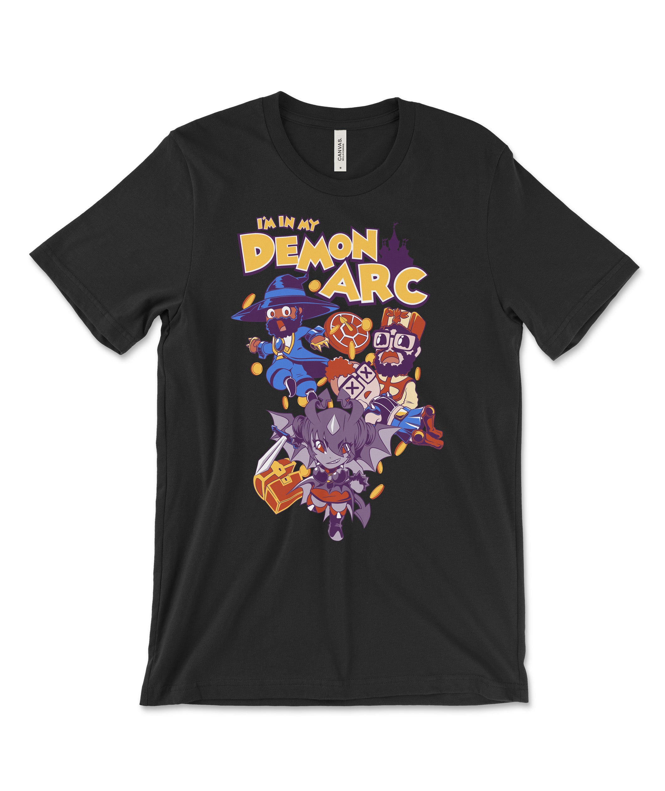 Inspired by the unhinged events and inside goofs spawned from their chain of Dokapon Kingdom: Connect streams, this shirt is a celebration of their struggles with assassin robots, untrustworthy thieves, alien abductions, and of course, becoming a demon and wrecking everyone else's property.