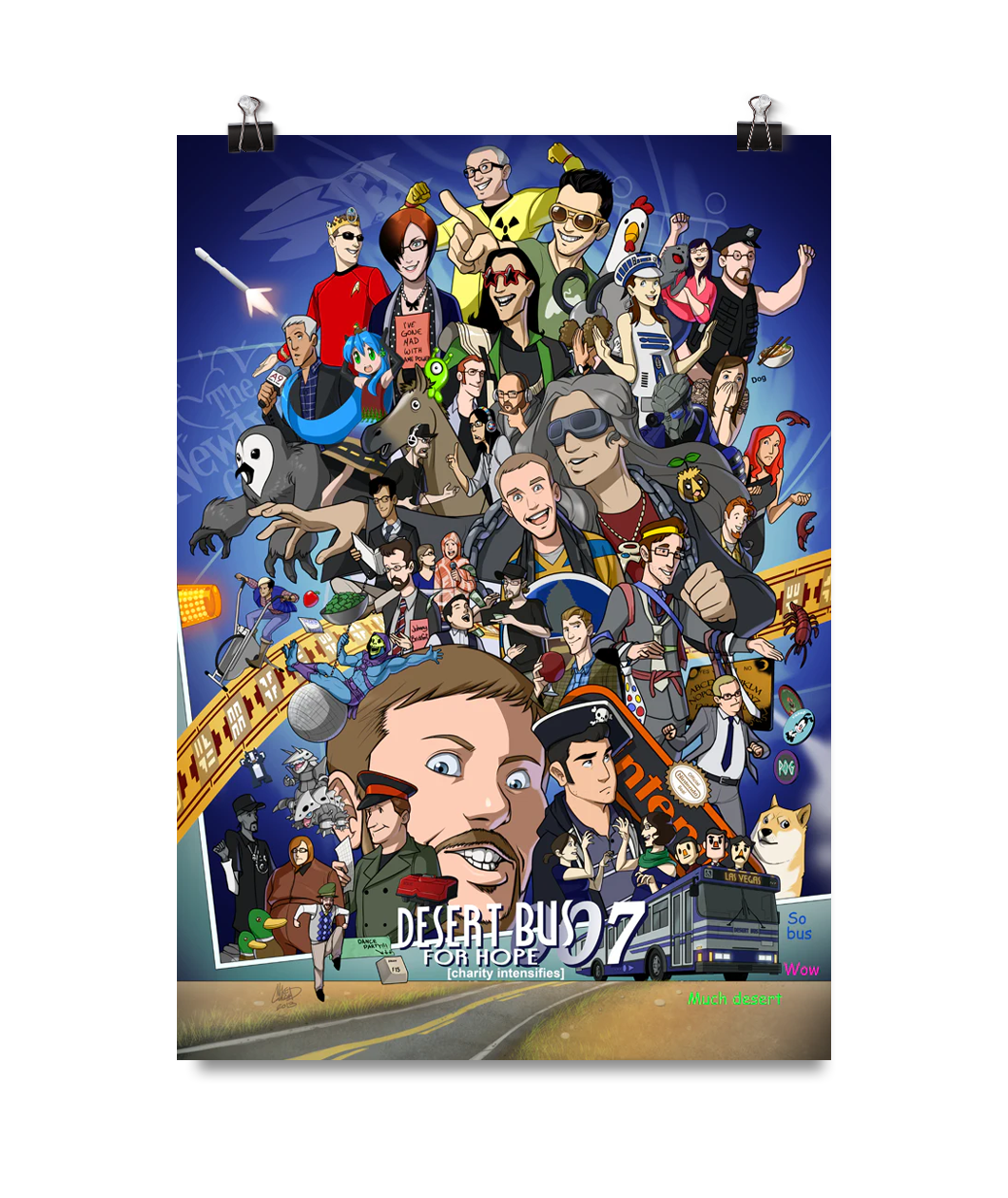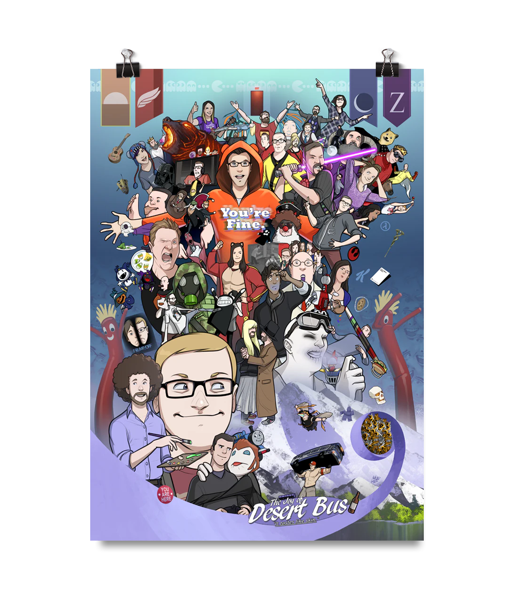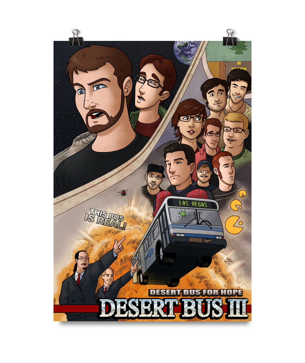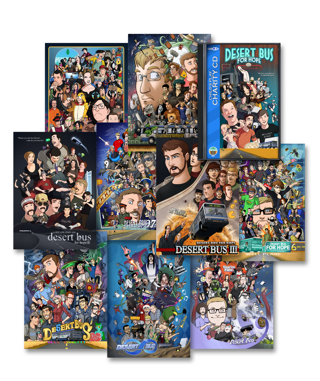 Decorate your walls with a full decade of Desert Bus! Featuring posters for the first ten years of Desert Bus, including Desert Bus 1, 2 and 3 posters that weren't available during those years! Think of them as "retcon" posters.