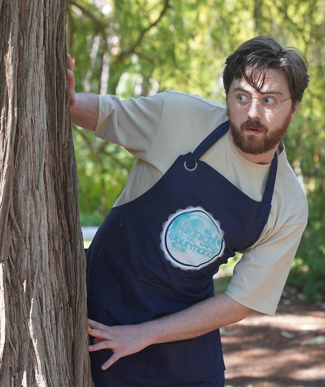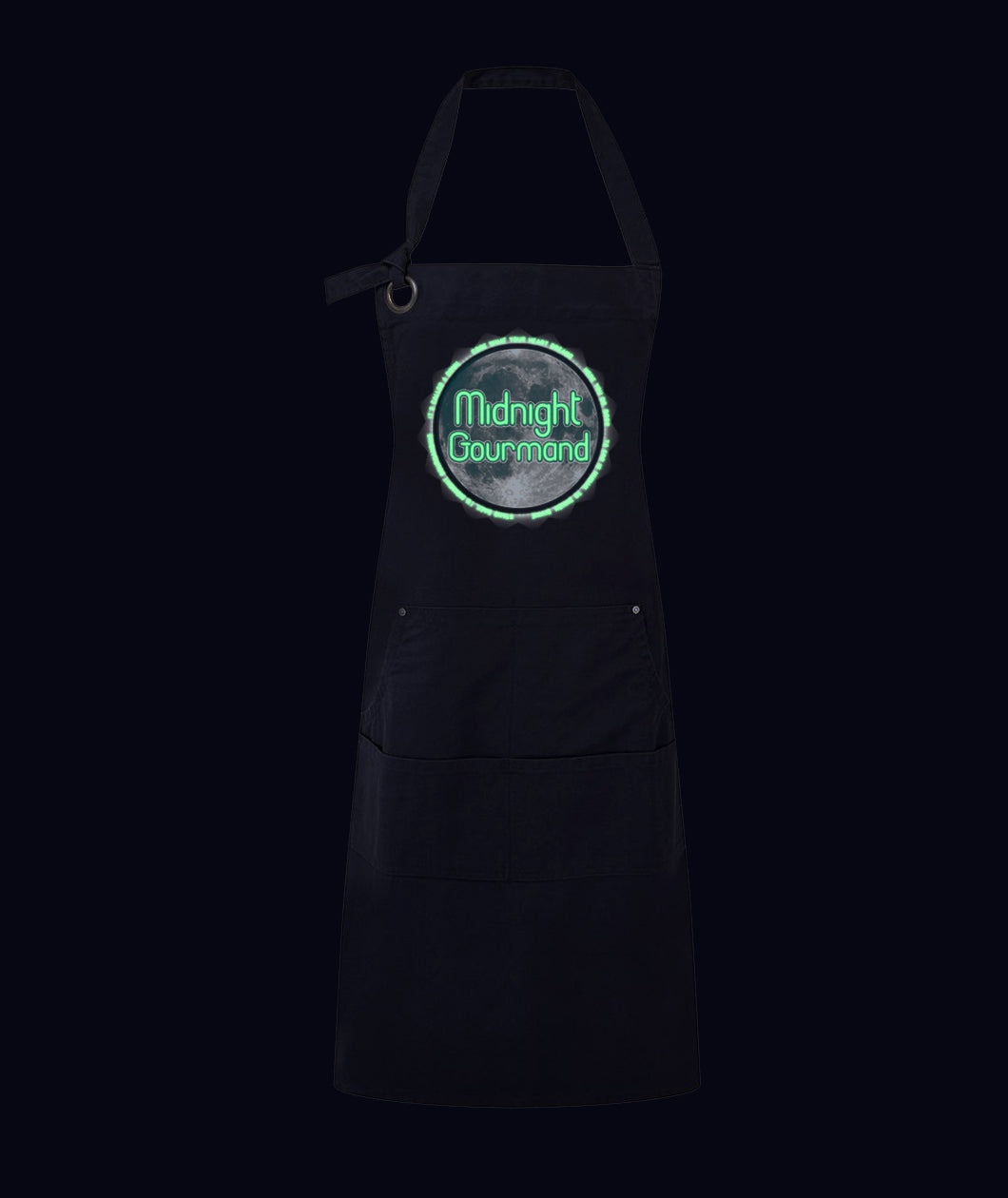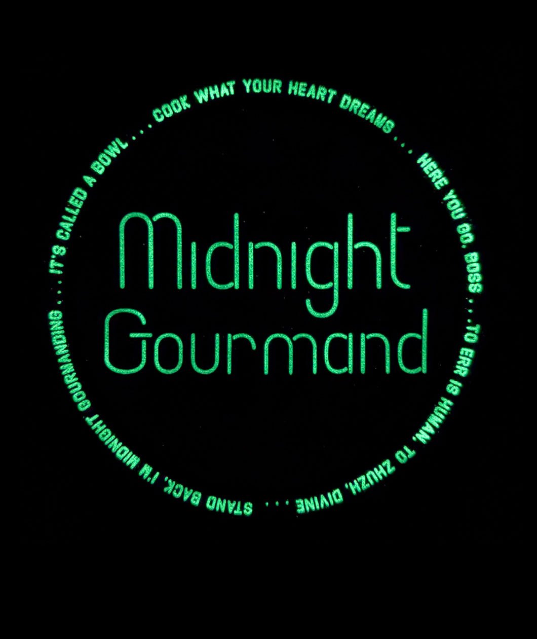 When you're living the Midnight Gourmand lifestyle, sometimes things can get a little messy. Let this apron keep you clean on your journey toward the perfect midnight snack. And if you're truly gourmand-ing at midnight, glow-in-the-dark ink will reveal important phrases to keep you in the midnight gourmindset.