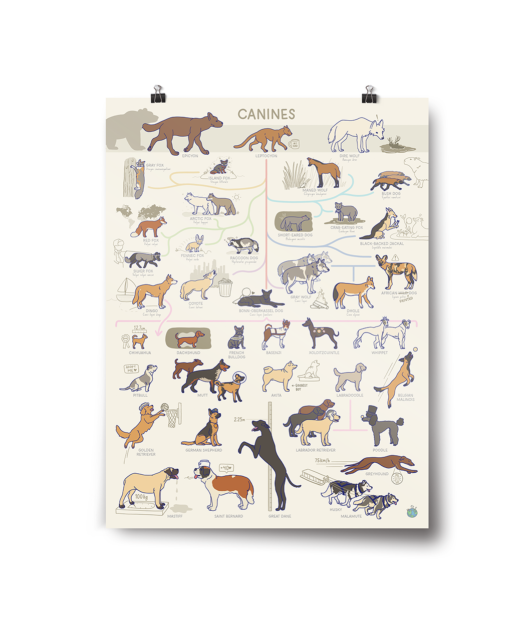 Know your doggos! We’ve made the definitive canine family tree, from dire wolves to chihuahuas. The drawings also include additional doodles that provide little info nuggets about the species or breed. It’s a beautiful piece of educational art, perfect for your living room or classroom.