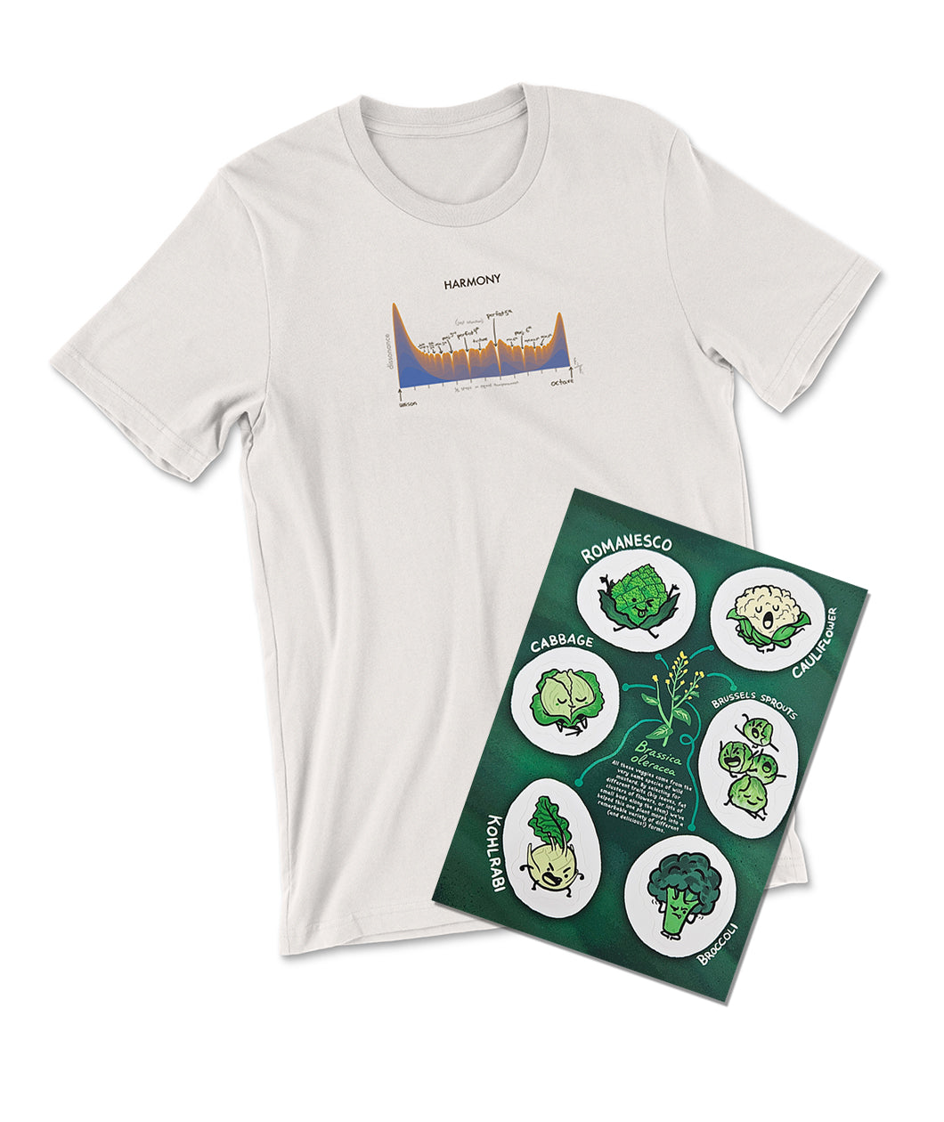 This bundle includes MinutePhysics' Harmony/Dissonance Tee in the Vintage White variant and MinuteFood's Brassica Gang Sticker Sheet.