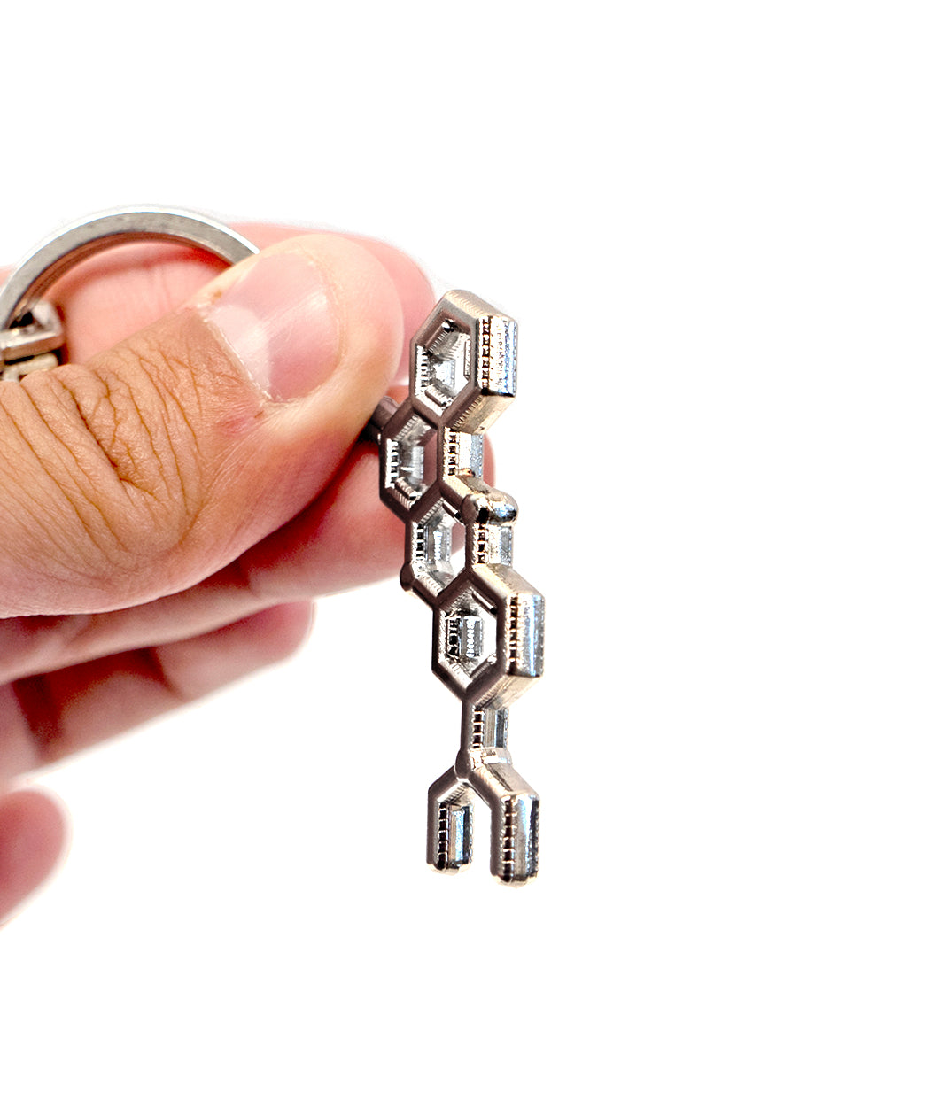 This molecule keychain is an accurate depiction of the structure of NileRed (the chemical). The keychain is two-sided (fully 3D) and is about the length of a key, so it fits well on your keychain and comfortably in your pocket.