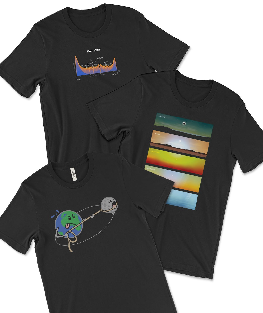 This bundle includes the MinutePhysics' Harmony/Dissonance Tee (Black variant), MinuteEarth's Solar Eclipses Across The Solar System Tee (Black Variant) and MinuteEarth's Earth and Moon Shirt.