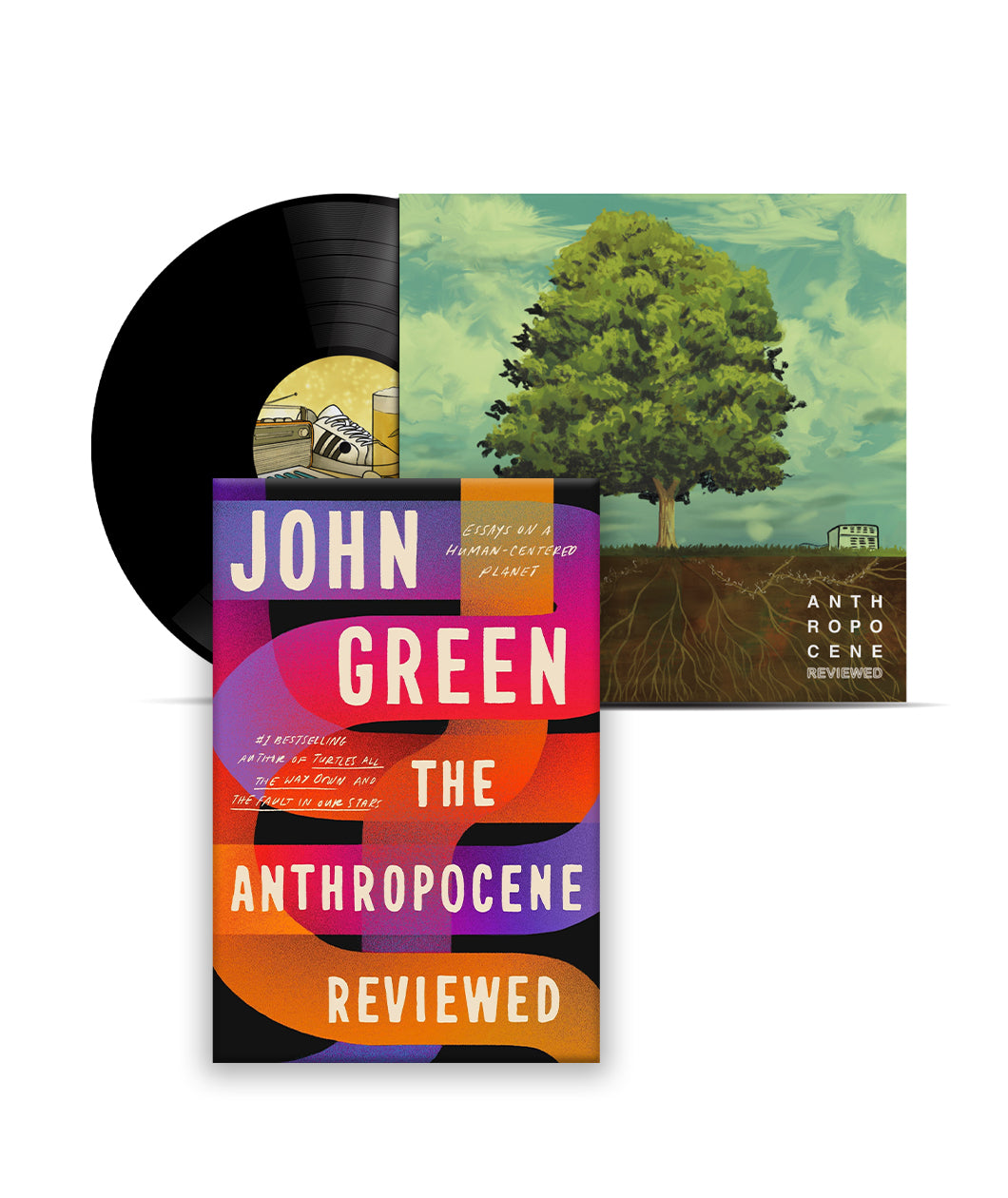 This product includes one unsigned copy of The Anthropocene Reviewed and one vinyl record of the Anthropocene Reviewed.