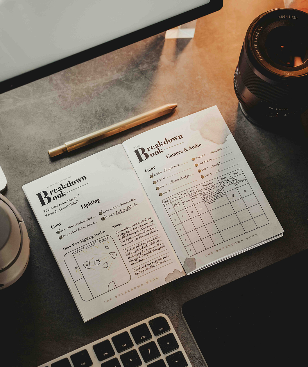 Workbook to track lighting, shot lists, gear, cameras and action.